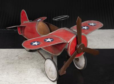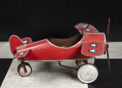 CHILDRENS AEROPLANE: A circa 1930s childrens pedal car plane, 66cm high, 118cm wide, 102cm deep