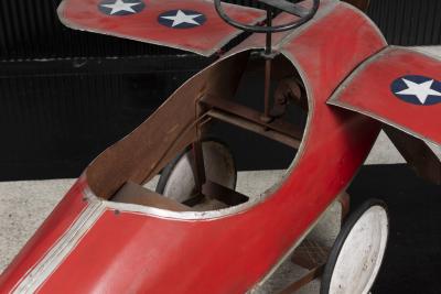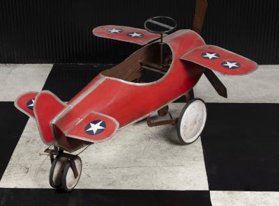 CHILDRENS AEROPLANE: A circa 1930s childrens pedal car plane, red painted pressed steel, single propeller, rubber tires with working metal wheels and steering, 66cm high, 118cm wide, 102cm deep