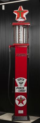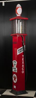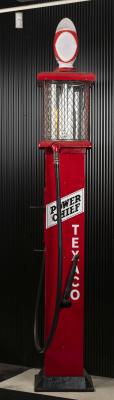 BOWSER: A circa 1920s/1930s Woodward 6-gallon gravity feed petrol bowser in Texaco Power Chief livery, with Perspex cylinder and plastic globe with affixed markers plate of "Woodward and Co Engineering, Kensington VIC", 287cm high overall