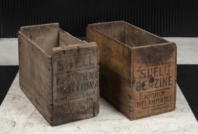 SHELL: Two early 20th century Shell oil tin timber packing crates