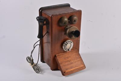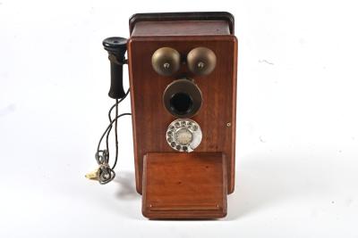 PHONE: An antique timber wall mount telephone, with 1970s wall plug fitting