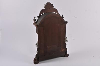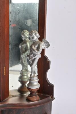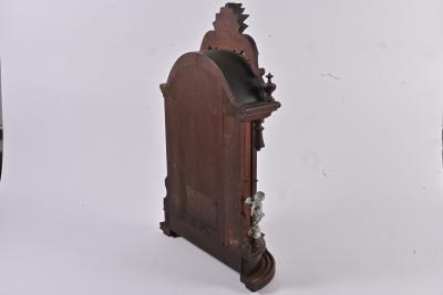 EIGHT DAY CLOCK: An early 20th century walnut eight day Triumph mantel clock by the Ansonia Clock Company, the dial with Roman numerals dial behind a painted door and flanked with cherubs, in working order with key but not recently serviced or timed, 62 cm high