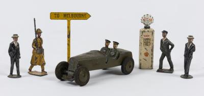 DIORAMA FIGURES: A collection of early 20th century lead figures including a Shell bowser and signpost to Melbourne, the signpost 7.5cm high