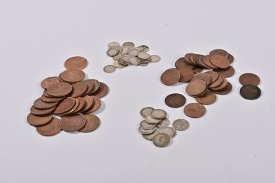 COINS: A collection of pre-decimal coins, comprising 30 half pennies, 24 pennies, 27 threepence coins and 13 sixpence coins