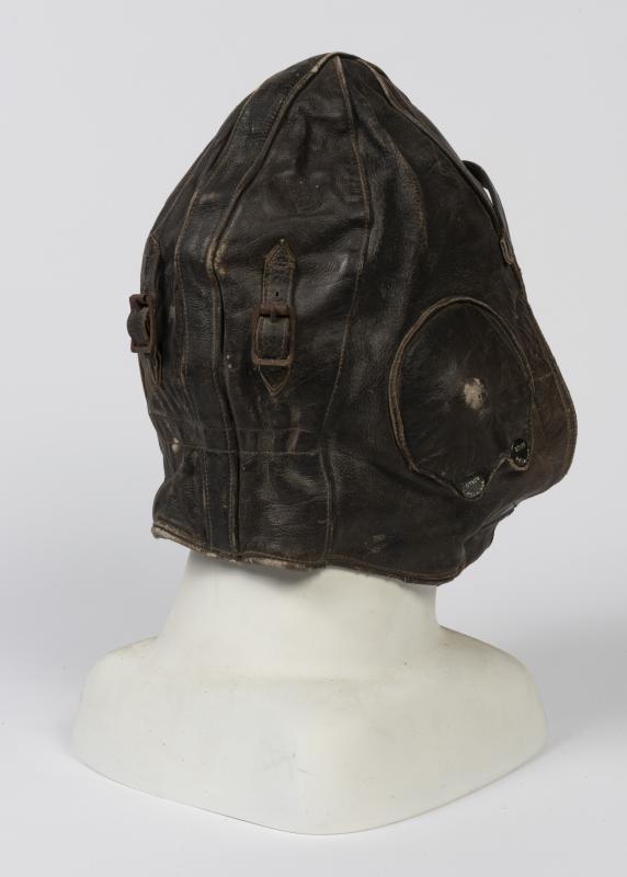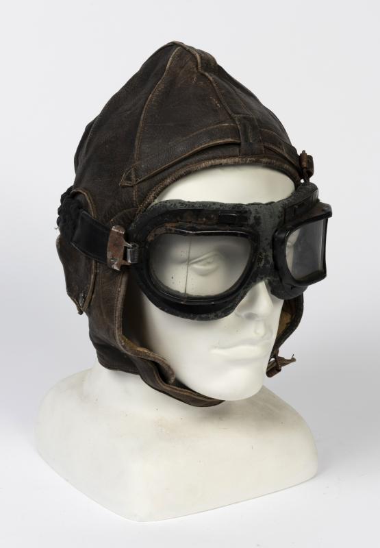 WWII FLYING HELMET AND GOGGLES: An Australian made WWI brown leather flying helmet with headphones and a pair of goggles, bears embroidered label to the interior 'Stagg Gloves'. Stagg helmets are thought to have been worn by RAAF aircrew in Malaya circa 1941-42.