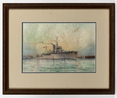 HAROLD DALTON (HARRY) HALL (British, Australian, 1881-1946), Battleship (Untitled), oil on canvas, image size 24 x 35.5cm, frame size 45 x 56cm