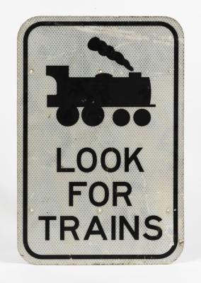RAILWAYS: A warning sign "Look For Trains" vinyl letters on reflective platen, 45 x 30cm