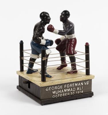 MUHAMMAD ALI: A cast iron moneybox commemorating the Rumble in the Jungle between Muhammad Ali and George Foreman, 1974, with mechanical operated arms, 21cm high
