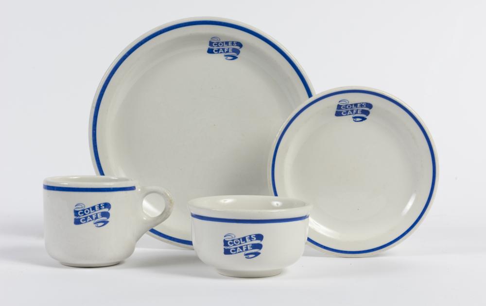 COLES: A vintage Coles Cafe cup, bowl, side plate and dinner plate