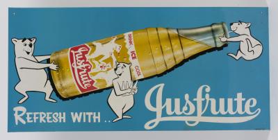 JUSFRUTE: An original Jusfrute "Refresh with ..." tin advertising sign, 36.4 x 77cm