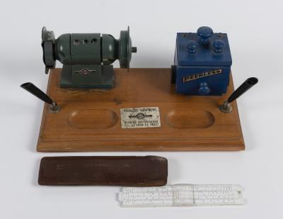 DESK SET: A Peerless Equipment promotional desk set and calendar modelled as a grinder, together with a slide rule in leather sheath