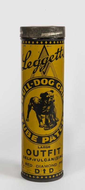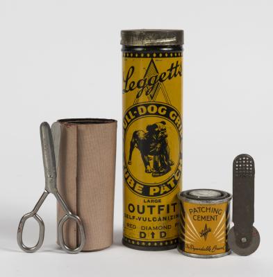 TUBE PATCH: A vintage tin of Bull-Dog Grip Tube Patch competing with contents of a roll of rubber patch, a tin of patching cement, a pair of scissors and a patching tool, 17.5cm