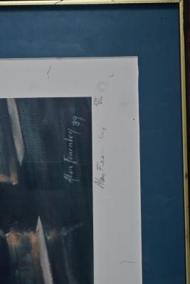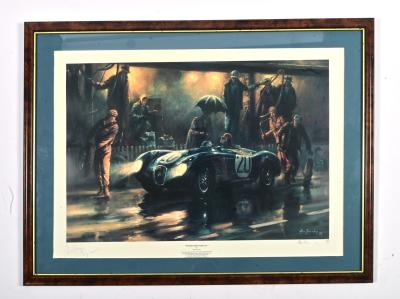 JAGUAR: A limited edition (238/850) photographic print 'Winners first Time out' by Alan Fearnley, signed by Lofty England and the artist and numbered 238/850, window mounted, framed and glazed, 54 x 74cm overall, faded.