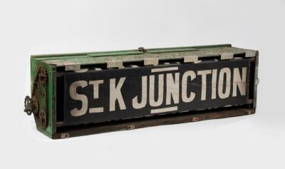 TRAM: An early original Victorian tram destination mechanical box, currently displaying 'St Kilda Junction', 31.5cm high, 117cm wide
