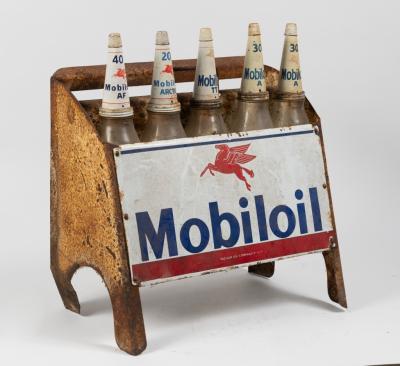 MOBILOIL: A Mobiloil 'Vacuum Oil Company' 10 bottle oil rack with enameled sign and five one pint glass oil bottles with various Mobil tin tops including 40 AF, 20 Arctic,Mobilmix TT, 30 A, 30 A, all with tin dust caps, bottles left with some residue of oil.