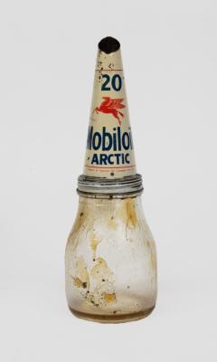MOBIL: A one imperial glass pint oil bottle with original Mobiloil '20' 'Arctic' tin pourer, featuring the flying pegasus, oil residue remains in glass bottle.