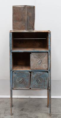 DEPRESSION CHEST: A depression storage chest, made of Shell 'Motor Spirit' and 'ATLANTIC UNION' oil tin cans as drawers; chest measures 116cm high, 53.5cm wide, 37cm deep.