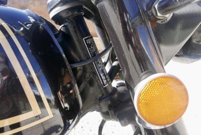 Showing 7,972 miles on the clock (which appears to have been zeroed at the time of the rebuild) and finished in the classic CB350 colour scheme of Glory Blue Black with gold stripes, the Honda still presents well, the saddle showing little wear and the paint has only a few minor scratches. Evidently lightly used since the restoration, there is some pitting on the chrome mudguards and other parts.