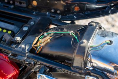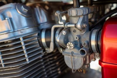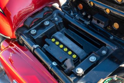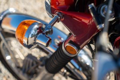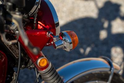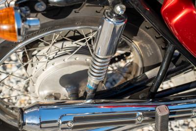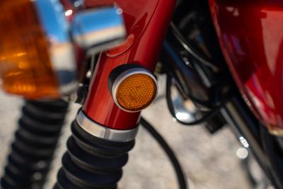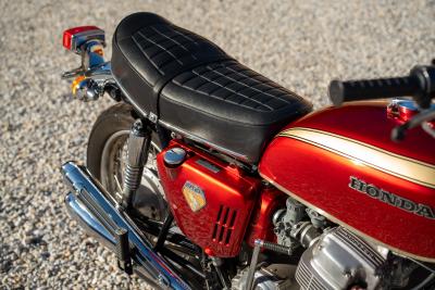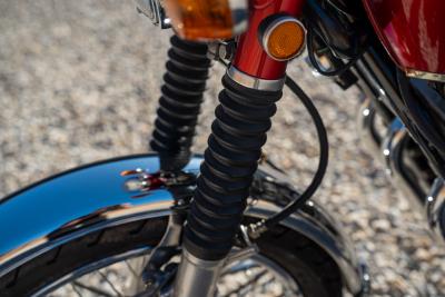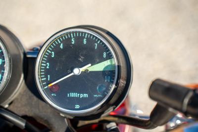 Showing 46,659 miles on the clock, the Honda was originally an American version and presents in lovely cosmetic condition, the Candy Ruby Red duco free from any scratches or blemishes, the saddle has hardly any wear and the chrome guards are free from pitting. All the rubbers, including grips, pegs and fork gators, appear to be like new and the Honda has clearly benefited from extensive refurbishment in the past.