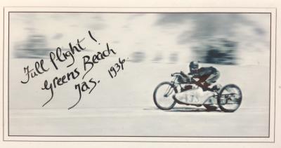 This competition 1927 AJS 350 HR7 was initially purchased by Trevor and Wilf Jowett, the AJS Agents for northern Tasmania. They owned the AJS outlet in Launceston and prepared this HR7 for speed records. During the mid-1930s, at Bakers and Green's Beach in Tasmania, this HR7 set two Australian records for the standing and flying quarter mile with a sidecar and passenger. In solo form and running on alcohol the bike achieved a speed of a 97 mph (155.2 km/h) on Green's Beach in the mid-1930s. It was subsequently successful in beach racing and hill climbs through until the mid-1950s. In 1939 the Jowett’s also acquired the sole AJS twin-cylinder supercharged record attempt machine from Eric Fernihough’s estate in the UK. This was sold soon afterwards following Trevor Jowett’s enlistment in the Australian Army.