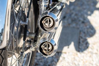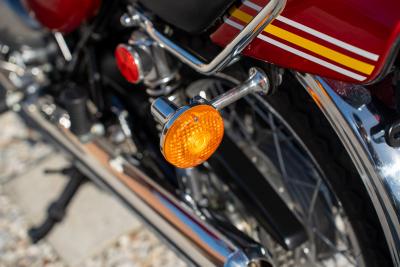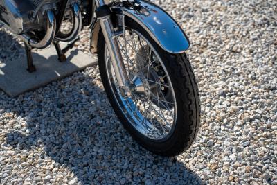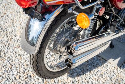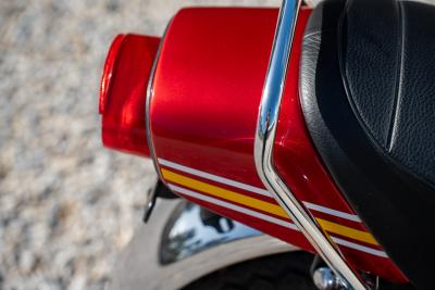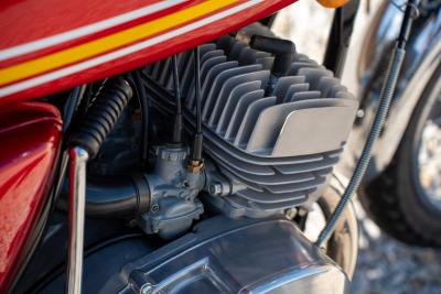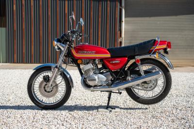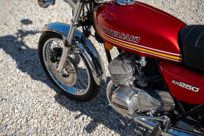 Last registered in 1991 and still wearing its original plates, the Kawasaki’s originality and low mileage (of just over 37,000 kms) caught the attention of our vendor who was looking for a suitable candidate to restore and this proved to be an excellent starting point, having been stored in a dry climate for several decades. Embarking on an sensitive restoration the preserved the KH250’s originality wherever possible, our vendor had the tank painted by the Late Ron Keed in period correct Candy Super Red and the bike benefited from new bearings and seals throughout. The engine was found to have very little wear and genuine NOS Kawasaki pistons and rings were used, leaving the cylinder bores standard. The result is a bike that presents in excellent cosmetic and mechanical condition today, starting easily and ready to be enjoyed by the fortunate new owner.