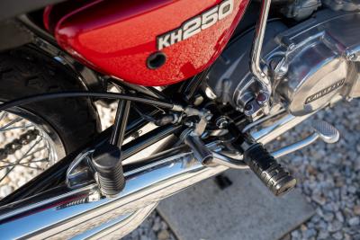 Part of the rebranded KH (Kawasaki Highway) range launched in 1976 that also included both 400cc and 500cc models, the KH250 replaced the S3 with numerous updates. The baby of the KH range featured the same piston-port air-cooled triple as its predecessors although output was reduced slightly to 28 horsepower at 7500rpm, sacrificing a little power in search of greater reliability and fuel economy.
