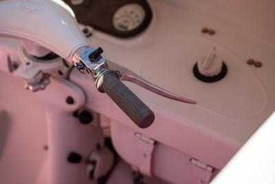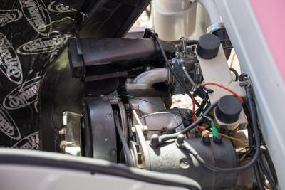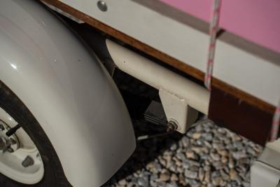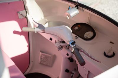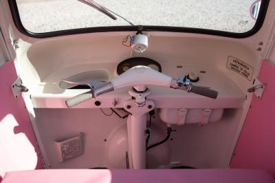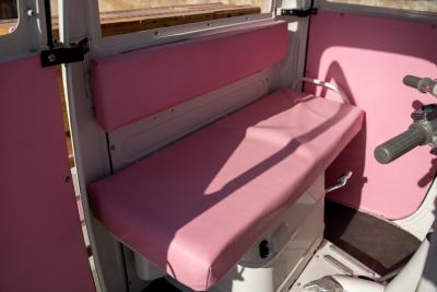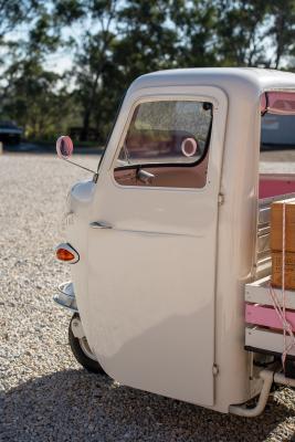 The cab benefited from a new windscreen and an electric window wiper, while the timber tray bed is neatly finished. There is an original tool box and spare wheel carrier and the Lambretta is nicely presented in white while the pink details can easily be changed to suit the new owner’s requirements.