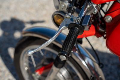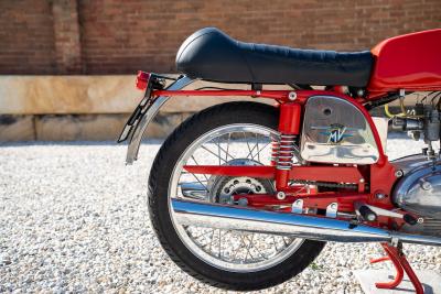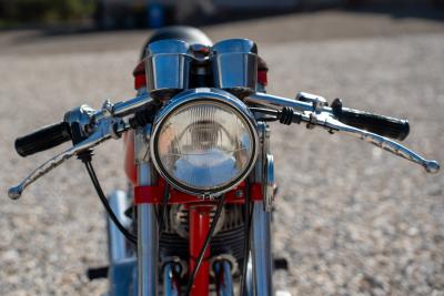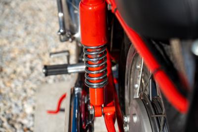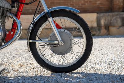 The 350B chassis owed more to the 1950s than 1960s. Utilising the engine as a stressed member, the frame included a single front downtube. There were 18-inch wheels front and rear, with full width Grimeca drum brakes. The 149kg 350B topped out at around 160 kph. A typical Italian café racer of the era, it featured clip-on handlebars and rear-set footpegs. And because the power was moderate it didn’t tax the chassis unnecessarily.