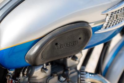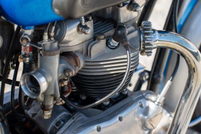 Addressing the controversial styling of the original T120, Triumph came up with an entirely new look for 1960, starting with a redesigned “duplex” frame with twin front downtubes, a new QD headlamp and slimmer mudguards, along with various mechanical improvements including an AC alternator in place of the old DC dynamo. Marketed as the TR7 in the United States the ‘A’ being the road version and the ‘B’ an off-roader, the new Pearl Grey on Azure Blue was certainly more pleasing to the eye and this, combined with the new frame’s improved handling, saw a big improvement in sales.