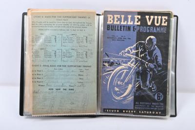 BELLEVUE: A collection of Bellevue Speedway (Manchester UK) Bulletin & Programmes ranging from 1936-1961. 13 programmes in total, most 1930s-1940s however a few 1950s and 1960s programmes. All housed within a A5 sized display folder. |