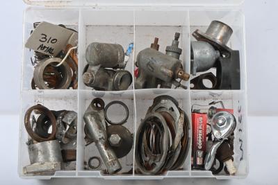 AMAL: A plastic container containing Amal carburettor parts and other motorcycle assortments. |