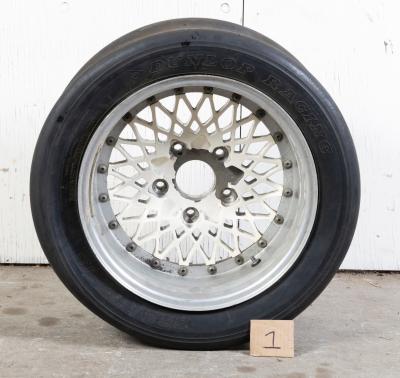 PORSCHE: A set of 15 inch racing wheels including two front MAHLE-BBS 290 0884 8Jx15 H2 e=10 1.6 rims without tyres along with two rear BBS style wheels fitted with Dunlop Racing tyres 305/575-15 - Chrome lips and white painted centres, possibly suited to a Porsche 911.