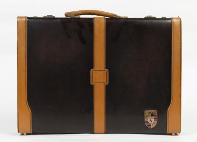PORSCHE: A high quality factory brown leather circa 1980s hand held brief case with affixed enameled Beverly Hills Porsche badge.