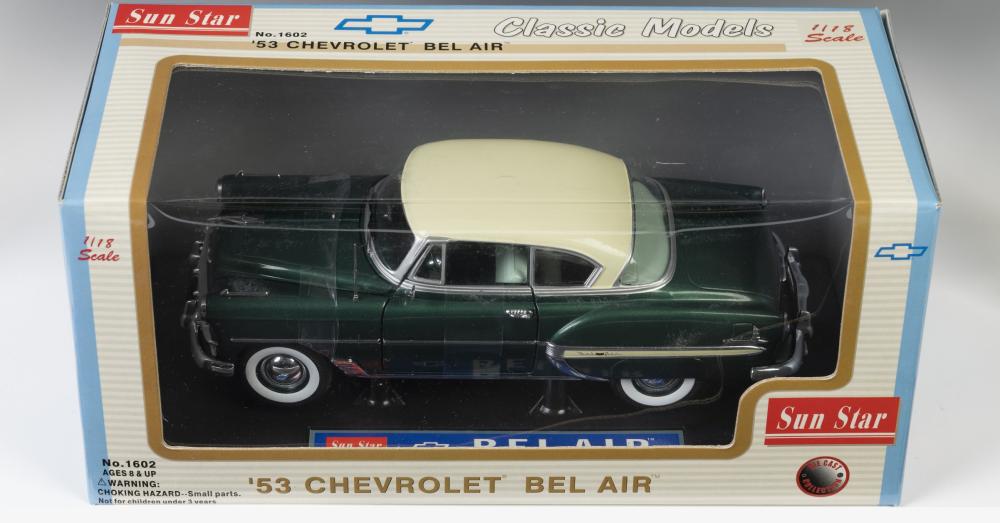 CHEVROLET BELAIR: A 1:18 scale 1953 Chevrolet Bel Air Coupe model, finished in cream over green paintwork, made by Sun Star models, model has opening parts, comes in original box