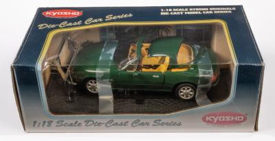 MAZDA MX-5: A 1:18 scale Mazda MX-5 Miata model, finished in green paintwork with a cream interior, made by Kyosho, model is  loose within box, with hardtop and hardtop stand also seen loose, in original box but has some fading