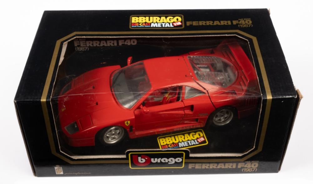 FERRARI F40: A 1:18 scale 1987 Ferrari F40 model, finished in red paintwork, made by Bburago, in all original packaging, has small crease in clear plastic
