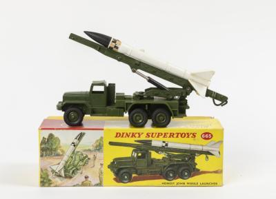 MISSILE LAUNCHER: A Dinky Supertoys No. 665 Honest John Missile Launcher, within original box made in England by Meccano Ltd, model complete with spring loaded mechanism for firing plastic missile, box with some light wear including pen writing to box end