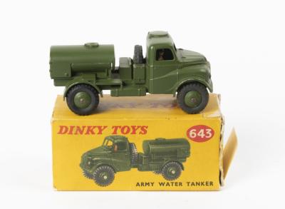 WATER TANK: A Dinky Toys No. 643 Army Water Tanker, in original box made in England by Meccano Ltd, model in good condition with minimal play wear, box used condition with tears to flaps including tape holding some on