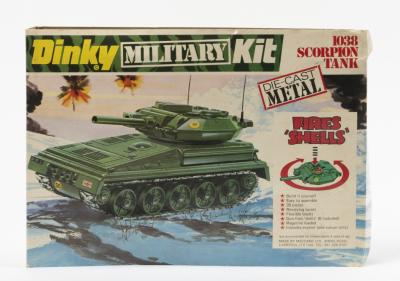 SCORPION TANK: A Dinky Military Kit No. 1038 Scorpion Tank, complete and sealed in original fold out box, made in England by Meccano Ltd 1975, some light wear to box including one small tear to top, one crack in plastic which holds wheels and smaller parts