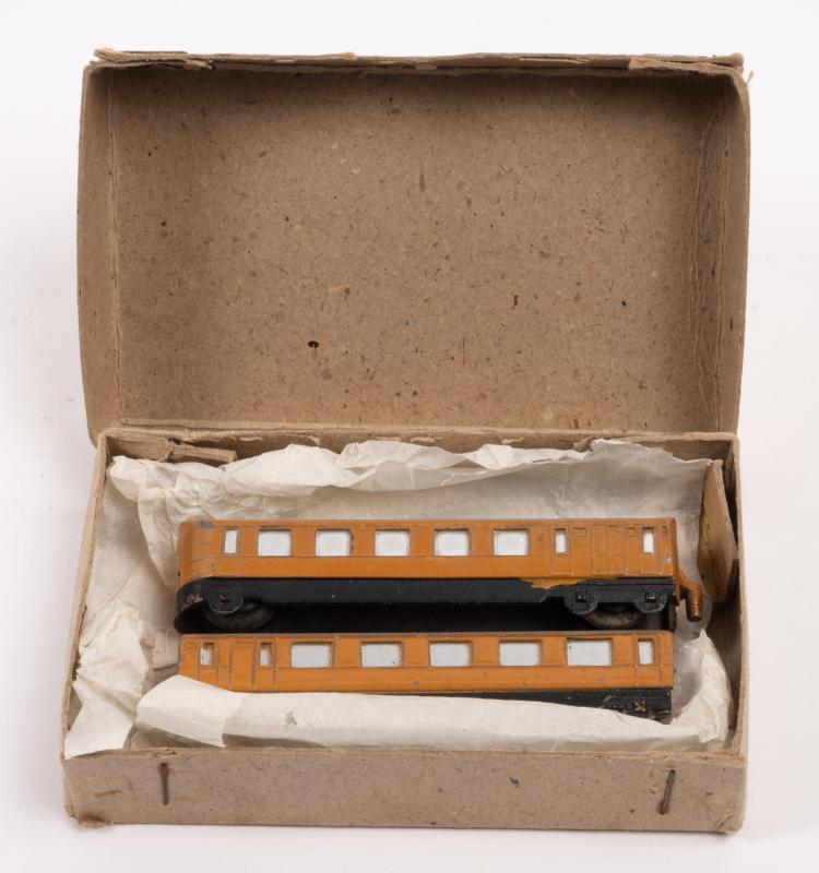 PASSENGER SET: A Dinky Toys No. 16 Express Passenger Set, comprising of to train carriages missing locomotive, in original box made in England by Meccano Ltd, carriages with some wear box with writing to lid