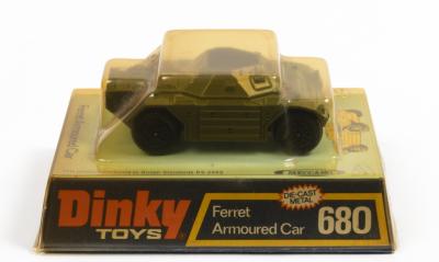 ARMOURED CAR: A Dinky Toys No. 680 Ferret Armoured Car, within original plastic bubble packaging made in England by Meccano Ltd, yellowed plastic no cracks