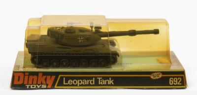 LEOPARD TANK: A Dinky Toys Leopard Tank No. 692 with plastic missiles, within original plastic bubble packaging, made in England by Meccano Ltd