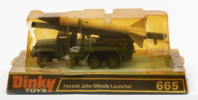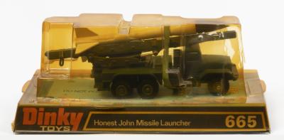 MISSILE LAUNCHER: A Dinky Toys No. 665 Honest John Missile Launcher, complete in original plastic bubble packaging, missile strapped to top of vehicle, platsic packaging yellowed and with multiple cracks, very brittle