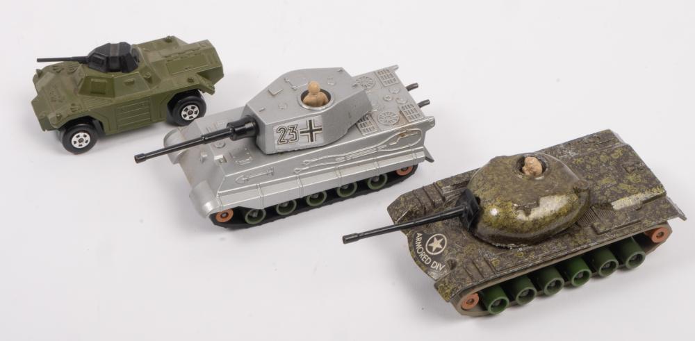 KING TIGER M48 WEASEL TANKS: A group lot of Matchbox tanks, including M48 main tank, King Tiger, Weasel, these models are both Battle Kings and Rola-matics, three pieces in total
