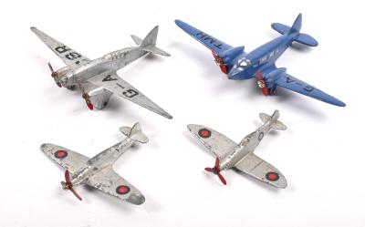 DINKY PLANES: A collection of four early Dinky planes including No.62M Light Transport plane in blue, 60G Light Racer, 62S Hawker Hurricane, and 62A Spitfire |