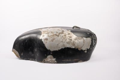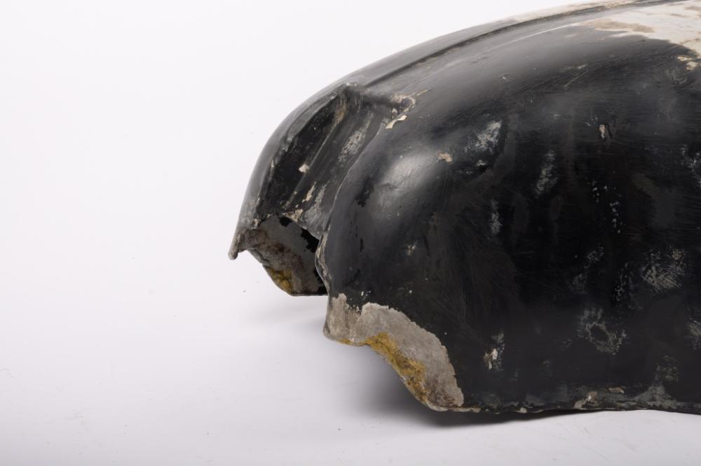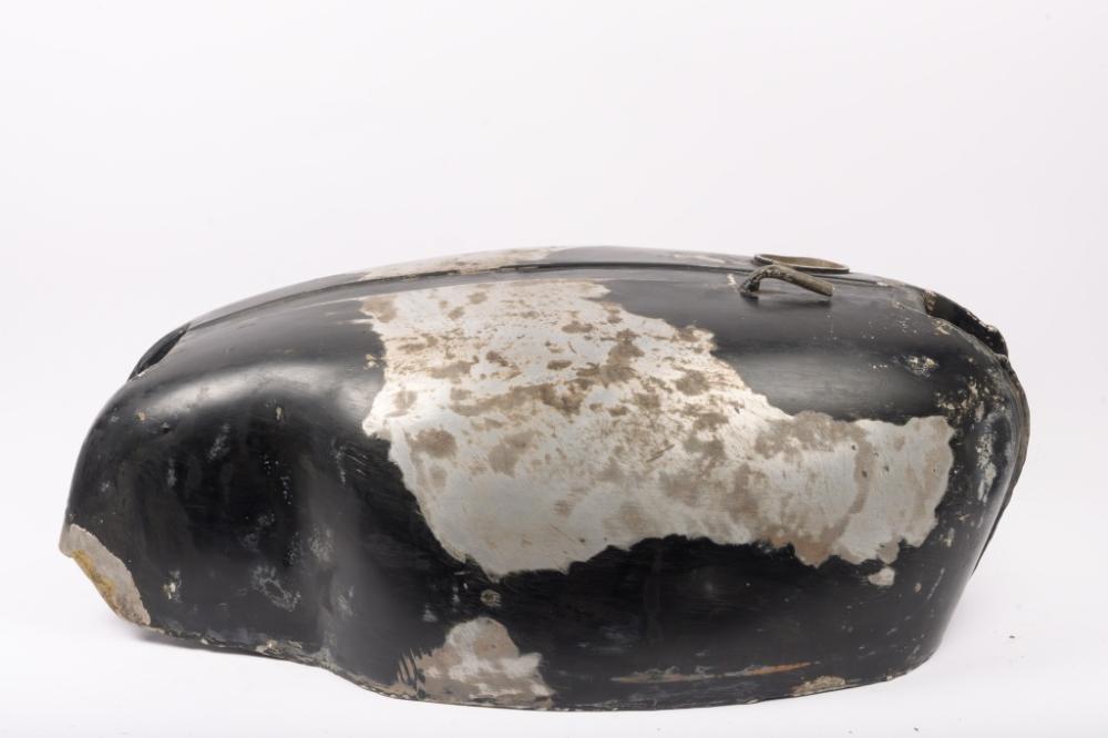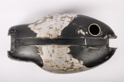 This original ’54 7R tank has had some crash damage repaired and is structurally sound, square and straight, not twisted or warped, but the fuel cap and neck mount was broken off. There is a small dent at the front right. The fuel tap boss threads and the rubber rear mount pockets are good. It is a strap mount tank and fits frames from 1953 onwards. It’s a big beautiful tank but needs appropriate restoration.