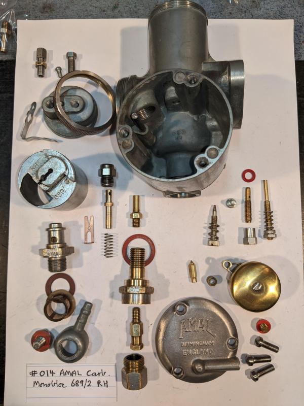This is an unusual right-hand AMAL 689 Monobloc carburettor with the “shared float bowl” cover having the outlet tube blanked off. It does not have a slide spring or needle but a new needle clip is included. Main Jet 430. Needle Jet 107. A No.20 pilot jet. Slide is a 689 RH No.3. No Air Valve/Choke assembly. A single fuel inlet banjo for ¼-inch hose. Dismantled, checked, ultrasonically cleaned and surfaces refinished. New washers fitted.