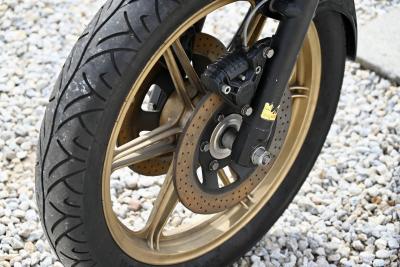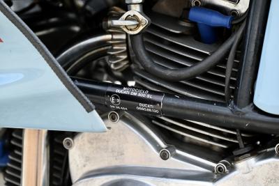 The engine was suspended in a trellis-style frame, with Marozzchi forks and three-way adjustable rear shocks, Brembo drilled disc brakes (dual up front), clad with a half fairing and and featuring a Nippon Denso instrument panel. The frame was finished in black with contrasting silver bodywork.