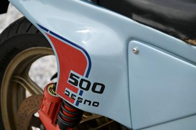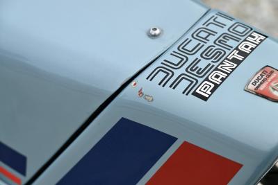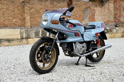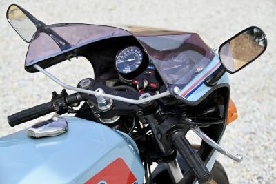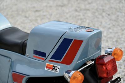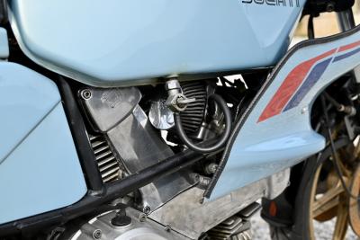 Dating from 1981, this rarely seen Ducati 500SL features the updated fairing shared with the larger 600 Pantah, finished in the beautiful silver blue with red/dark blue decals. The bike has the earlier Marzocchi forks and three-way adjustable shocks and appears to be in remarkably original condition aside from the aerodynamic visor.