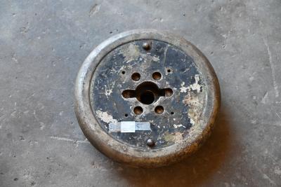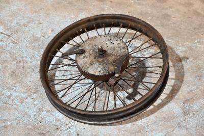 BSA: A circa 1930s front wheel with 6" brake drum, 19" rim, together with brake plate 5.5" diameter, not matching, likely BSA [Sydney] |